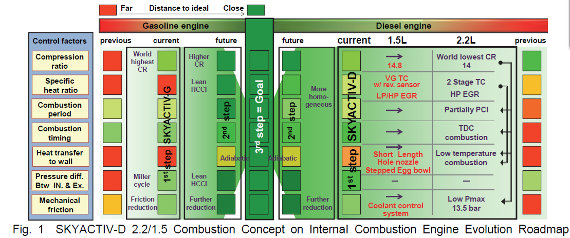その中でも注目すべきは圧縮比(Compression Ratio)です。Previous→Currentと色が薄くなって、Futureでは濃くなっています。つまり、SKYACTIV-Dでは世界一低い圧縮比を売りにしている訳ですが、実は「高い圧縮比」が理想の燃焼で、マツダはそれに向けて技術開発をしている可能性が高いです。